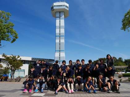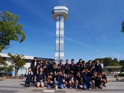 タワーをバックに集合写真です。一面に広がる澄み渡った青空に負けないくらいの、キラリ輝く笑顔いっぱいの4年生です。