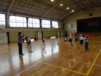 1年1組は、体育でボールをしっかりと投げる練習です。ボールの大きさを変えながらゲーム形式で行っています。