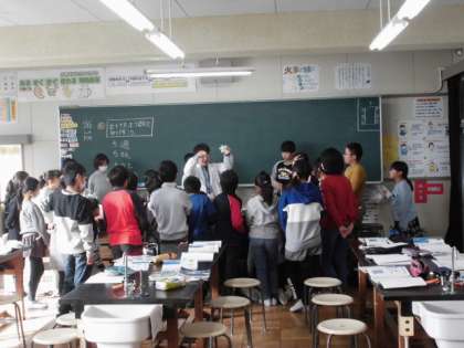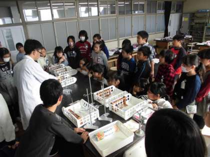 5年1組は、理科「溶かしたもののとり出し方」です。ホウ酸をろ過する実験をこれから行います。実験の手順を集中して聞いています。