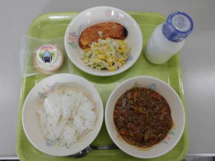 今日の給食は、ごはん、牛乳、138ドライカレー、チーズ入りうきうきオムレツのケチャップソース、キャベツとコーンのドレッシングあえ、お米タルトです。