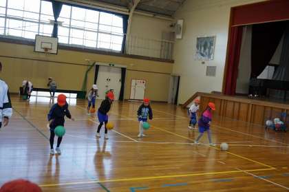 体育の授業でドッジボールを使ってドリブルの練習をしました。つく手を変えたり、進み方を変えたりして何度も取り組みました。