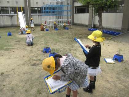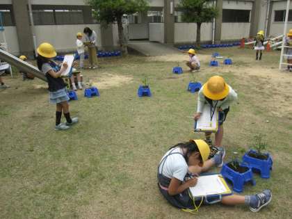 ミニトマトの観察を行いました。じっくりと観察し、苗の特徴や花の色など気づいたことを記録することができました。