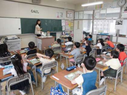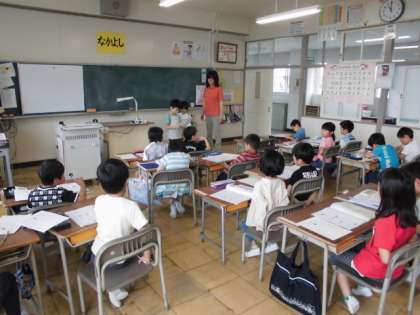 1年2組は、くつの整頓が上手にできている人を発表しています。この後、音読カードの確認や数字の書き取り練習を行いました。