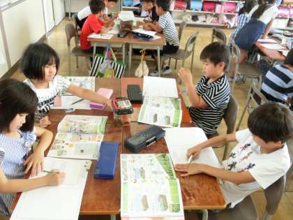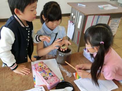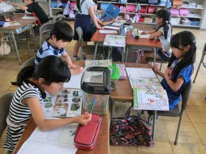 生活科の学習で、生き物の観察をしました。生き物の動く様子をみたり、図鑑で生き物の飼い方を調べたりしました。