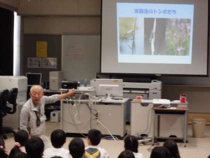 今日は、明日のヤゴ救出作戦にむけて、「とんぼ教室」が開講されました。講師の先生がいらっしゃり、とんぼやヤゴの生態について教えていただきました。そのお話の中では、とんぼの結婚や、とんぼの飛び方、とんぼの飼育の仕方などを学びました。最後には、私たちの命も虫たちの小さな命も同じ、「大切な命」というお話をしていただきました。みんなの飼育するヤゴも、立派なとんぼに育つといいですね。