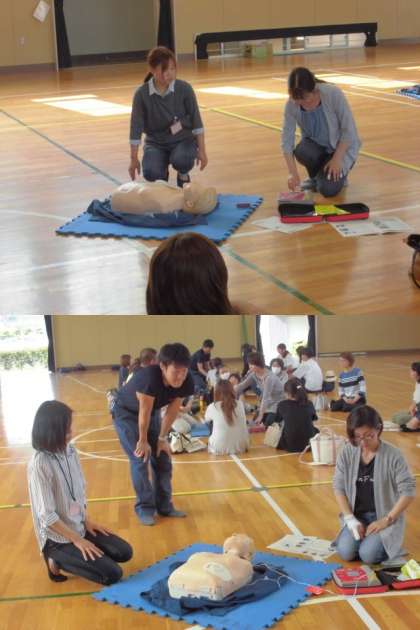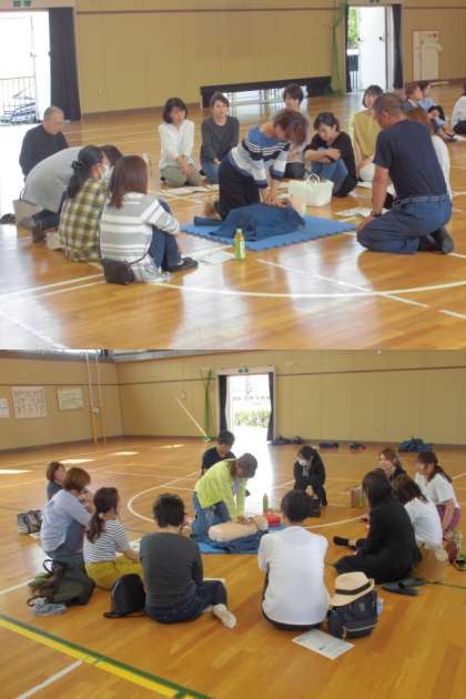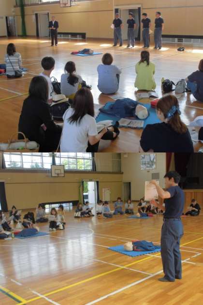PTA委員総会の後、屋内運動場において、一宮消防署千秋出張所の方に来校していただき、救命法の講習会を行いました。参加されたPTA役員や学級委員一人一人に、AEDの使い方と胸骨圧迫の実習をしていただきました。夏休みのプール当番に向けて、みなさん大変熱心に取り組んでいただきました。