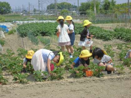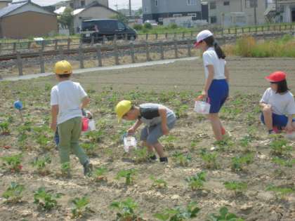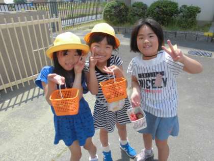 夏のような陽気の中、この週末に実ったイチゴを摘みに、2年生と5年生の児童が、中間放課に小学校東側の畑に集まりました。真っ赤に熟した美味しそうなイチゴやとても大きく生長した食べごたえのあるイチゴなど、たくさん摘むことができました。かごいっぱいのイチゴからはとてもいい香りがしてきました。みんな笑顔いっぱいで、楽しく満足できました。