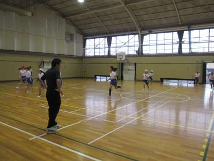 あいにくの雨天のため、陸上部の練習を屋内運動場で行いました。