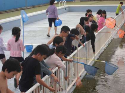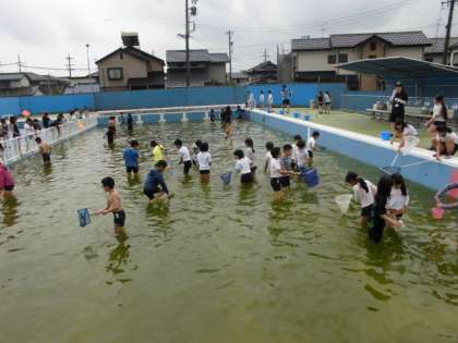 水位はひざ下ほどまで下がっていましたが、濁っている水の中からヤゴを探し出すのは難しく、子どもたちは一生懸命にヤゴを見つけていました。最初は水に入るのをためらっていた児童も最後には水に入って、ヤゴ取りを楽しんでいました。