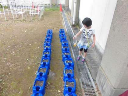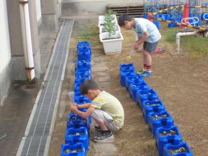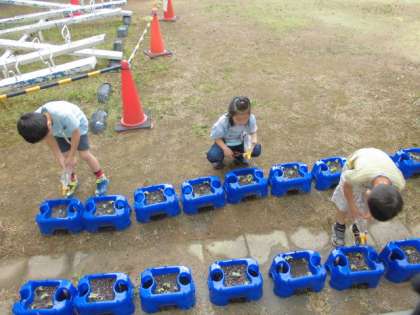 1年生は、中庭でアサガオを育てています。毎朝、忘れることなく水やりに励んでいます。早く芽が出てきてくれるといいですね。大きく育つように、明日からもしっかりお世話をしましょう。