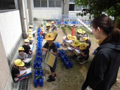 1年1組は、生活科で育てているアサガオに芽が出てきました。観察カードに絵とともに成長の様子をまとめています。