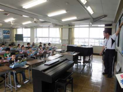 2年1組は、音楽「かえるのがっしょう」です。けん盤ハーモニカを使って輪唱を楽しんでいます。みなさん上手ですね。