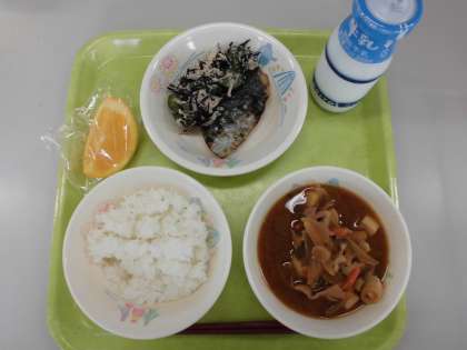 今日の給食は、ごはん、牛乳、豚汁、さわらの照り焼き、ひじきのささみあえ、オレンジです。