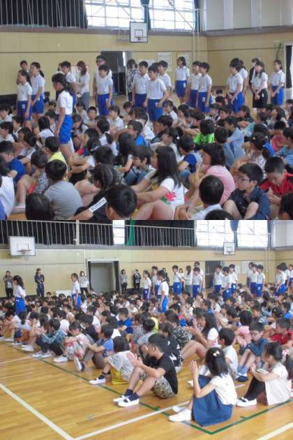 今日の朝礼では、まず、土曜日に行われた市小学生陸上選手権大会で、千秋東小の代表として頑張った選手の児童に、ねぎらいの拍手をみんなで贈りました。