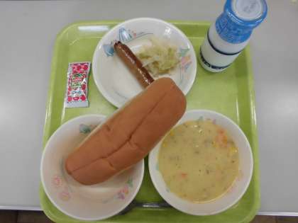 今日の給食は、サンドイッチロールパン、牛乳、コーンクリームスープ、焼きフランクフルト(トマトケチャップ)、ドレッシングキャベツです。