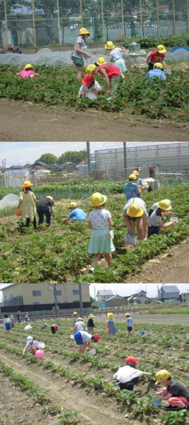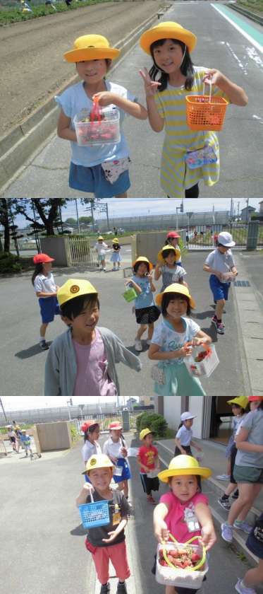 昨晩降った雨もすっかりと上がり、今日は気持ちのよい青空が広がりました。すっかり、赤く熟れたイチゴを中間放課に摘みに行きました。籠いっぱいに取れたイチゴを見て、とても満足げな笑顔の千秋東っ子です。