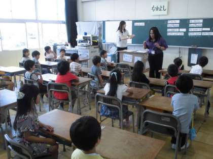 1年1組は、英語活動です。英語で簡単なあいさつを学習しています。大きな声で元気よく受け答えができましたね。
