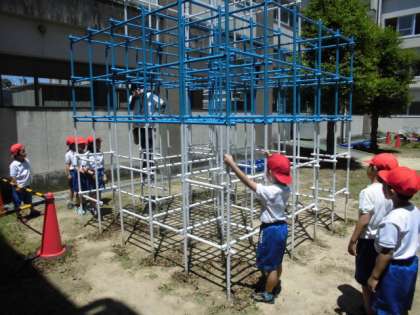 1年2組は、体育「遊具遊び」です。先生の動きを見ながら、ジャングルジムを使って移動していく方法を確認しています。