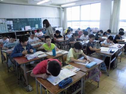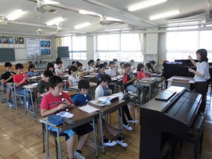 5年1組は、音楽「小さな約束」です。リコーダーの音が重なり合う響きを感じながら、どの子も集中して演奏しています。