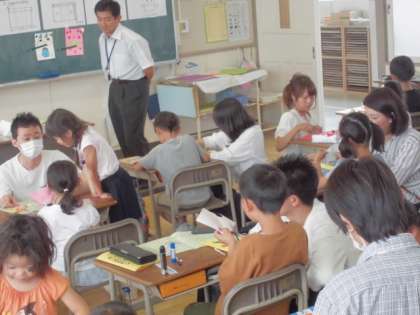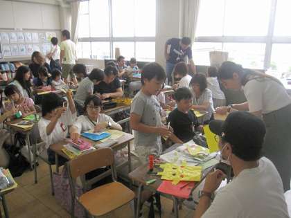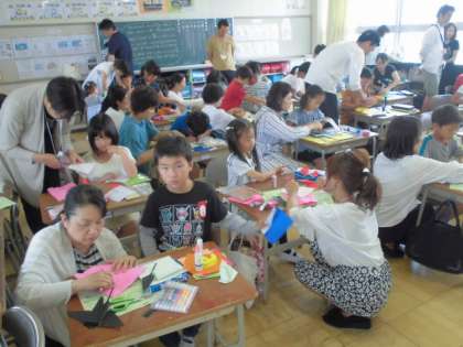 写真は、2年生ふれあい教室での様子です。お家の人に教えてもらいながら、子どもたちは作品作りに取り組むことができました。
