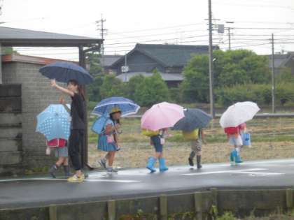 今日の学年下校では、先生たちによる付き添い下校を実施しました。低学年も高学年も、見守り隊の人たちや先生たちと一緒に、雨降る中を気をつけながら下校していきます。傘をさしたら一列で、安全に歩いていきましょう。見守り隊の人たちへの感謝の気持ちを忘れずに、いつもありがとうございます。