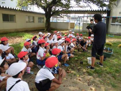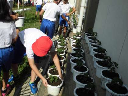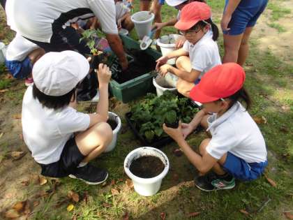 今日の朝は、4年生と一緒に、運動会で使用するサルビアの苗植えを行いました。先生の説明を真剣に聞いたり、4年生の動きを手本にしたりして、苗にふわふわの土のお布団をかけてあげていました。