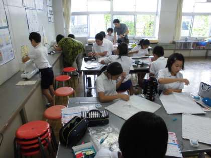 6年1組は、家庭科「ナップザック」です。しつけや返しぬいを確認した後、出し入れ口をていねいに縫っています。