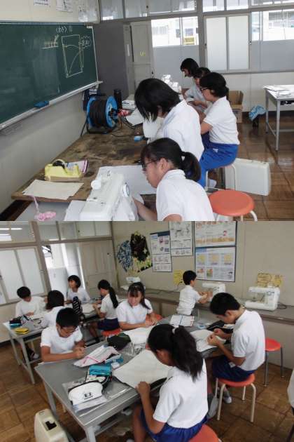 1学期からのナップザックづくりの続きをしました。今回は、出し入れ口をぬう準備をしました。