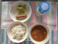 今日の給食は、ごはん、牛乳、冬瓜汁、ハンバーグのレモンソース、冷凍パインです。