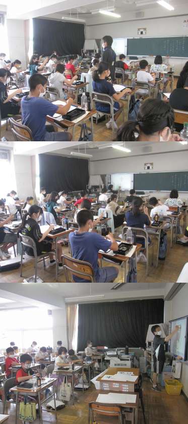 書写では、毛筆「歩む」の練習に取り組みました。音楽では、グループでリズムを重ねて表現できるように練習に取り組みました。