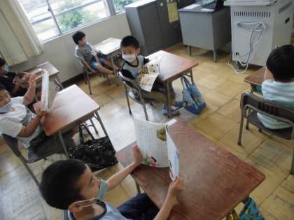 図画工作で、自分だけのおひさまの絵をかきました。みんな、時間いっぱい、集中して描くことができました。