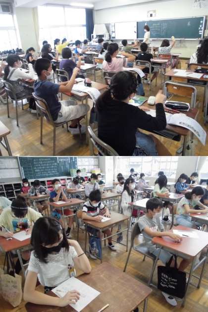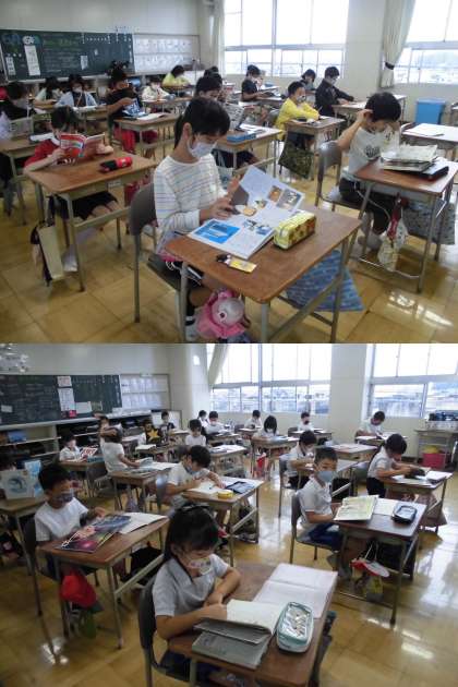 今日も元気に登校し、朝の手洗いをしてからの東っ子タイムです。静かに落ち着いて読書をしている学級もあれば、担任の先生のもとで、新出漢字の学習や算数の学習に、ドリルヤプリントで取り組んでいる学級もありました。