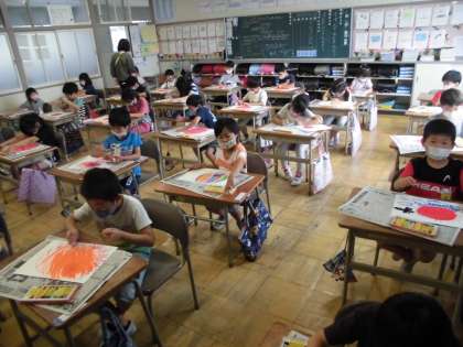 今日の2組は、図画工作の時間に、「おひさまニコニコ」を描きました。自分だけのオリジナルの太陽を思い思いの色で表現しました。