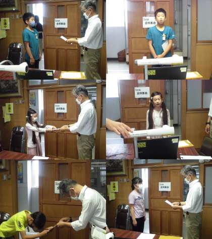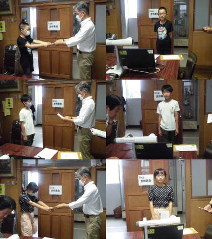 初めに、前期児童会役員の任命式が行われ、各役員の児童に、校長先生から任命状が手渡されました。任命状を手にした後、役員一人一人が、役員としての抱負をカメラの前で話しました。
