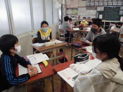 国語では、1年生と交流できるような遊びを班で話し合って決めました。1年生の視点で遊びを考える姿に、6年生としての責任と優しさを感じました。また、密にならないようなアイデアがたくさん出て、感心しました。学習面でも生活面でも、さすが6年生だと感じる場面が多くあります。