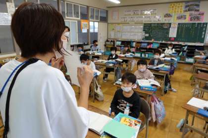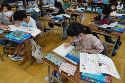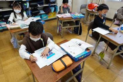 算数で九九の5の段です。唱えながらプリントに書きこみます。