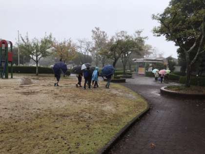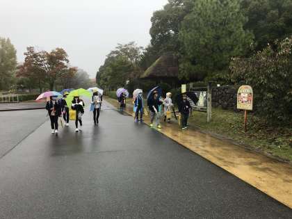 5年生は、校外学習でリトルワールドに来ています。あいにくの雨ですが、無事に到着し、各グループに分かれての調べ学習が始まりました。