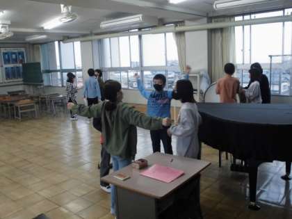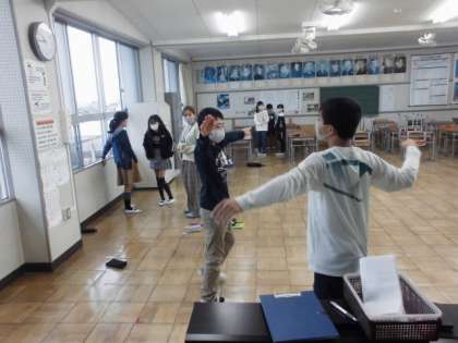 中間放課に、音楽室で6年生の児童が、運動会に向けて応援練習をしていました。赤白それぞれの応援団になった計16名が、太鼓のリズムを確認したり、応援の掛け声や振り付けを考えたりしていました。運動会の盛り上げ役として頑張ってくださいね。