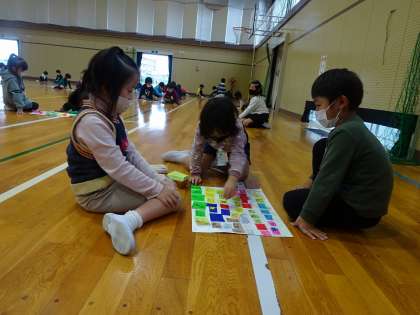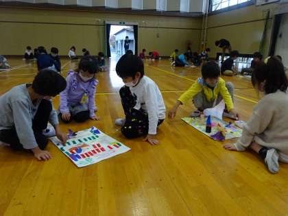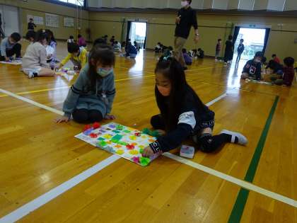 今日、突然決まった1・2年生すごろく大会。でも、さすが2年生です。おもちゃパーティーで一緒に遊んだ経験をいかし、すごろくの遊び方を優しく丁寧に教えながら、仲よく遊ぶことができました。