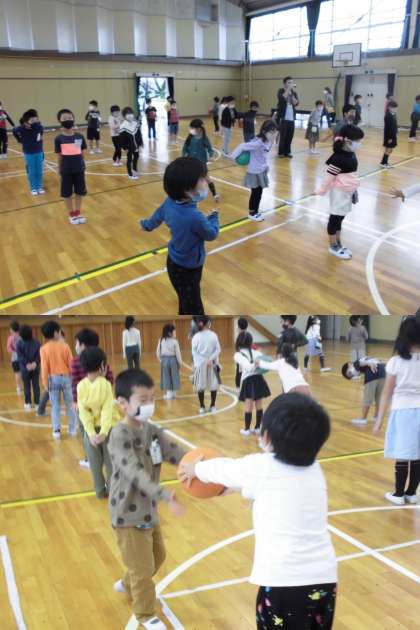 すごろくをした後は、”ボールおくり”をしました。ボールを下に落とさないように、次の人に送ったり、後ろ向きになって、後ろから来るボールを前の人に送ったりしました。その後は、”命令ゲーム”をしました。手を叩いた後の言葉に従うゲームで、立ったり、座ったり、気をつけをしたり、笑ったりしました。手を叩かないで言われた命令には従ってはいけないので、しっかり耳を澄まして、騙されないようにゲームをすることができました。