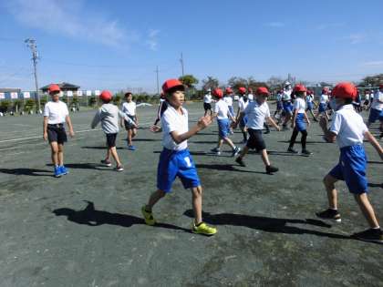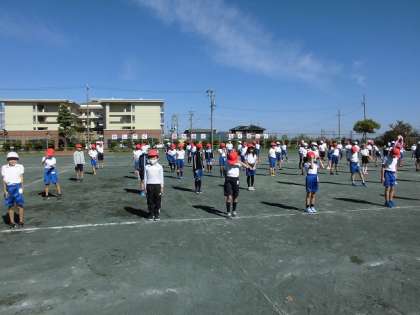 自分の立つ位置の確認と移動練習もします。まわりの物を目印にし、自分の場所の確認します。たて、よこがきれいにそろっていてとてもきれいでした。次の練習からも自分の場所を忘れずに、移動しましょう。