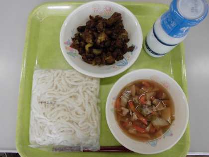 今日の給食は、白玉うどん、牛乳、五目うどん、さつまいもと大豆のあまがらめです。