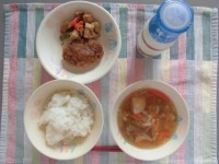 今日の給食は、ごはん、牛乳、オニオンスープ、ハンバーグのトマトソースがけです。