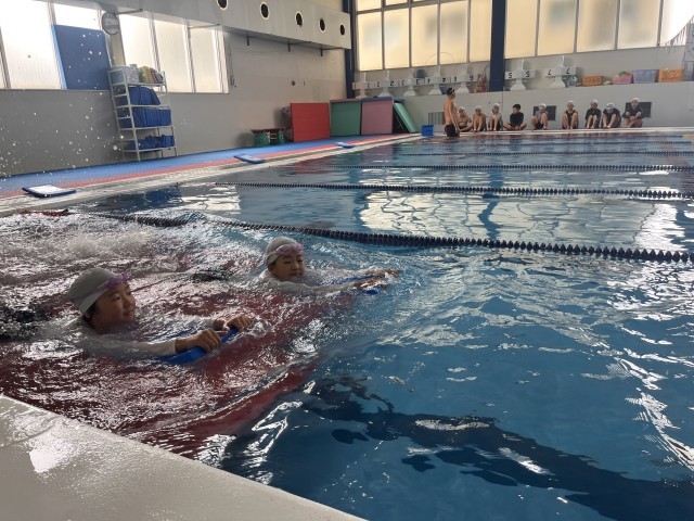 今日は水泳の授業がありました。コーチの話をしっかりと聞き、めきめき上達しています。