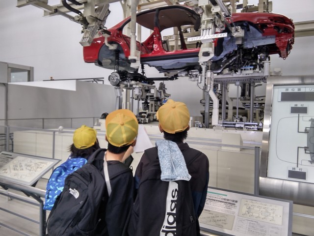 学校を出発し、トヨタ産業技術記念館に到着しました。私たちの生活に欠かせない自動車...