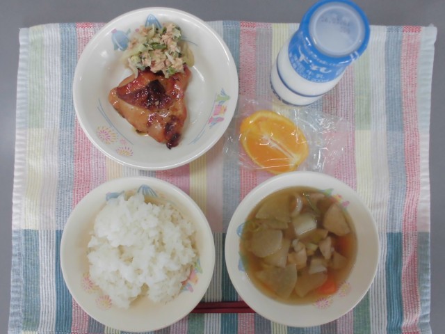今日の献立はご飯 牛乳 てりどり しゅんぎくのツナ和え 冬の根菜汁 しらぬいでし...