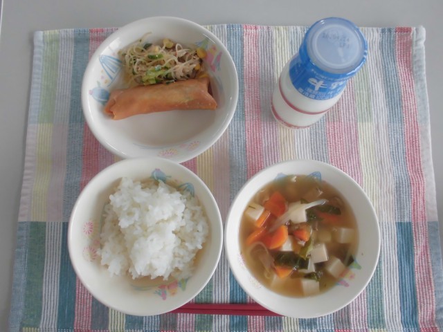 今日の献立はご飯 牛乳 春巻 バンサンスー チンゲンサイと豆腐の中華スープでした...