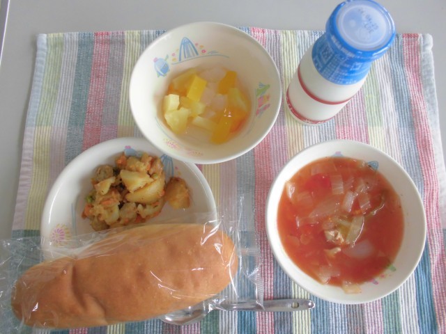 今日の献立は小麦入り米粉ロールパン 牛乳 じゃがいもとウインナーのコンソメいため...