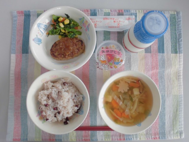 今日の献立は赤飯 牛乳 ハンバーグのおろしがけ なのはな和え 桜のすまし汁 お祝...