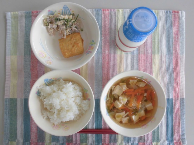 今日の献立はご飯 牛乳 さわらの天ぷら シャキシャキ和え 湯葉のすまし汁でした。...
